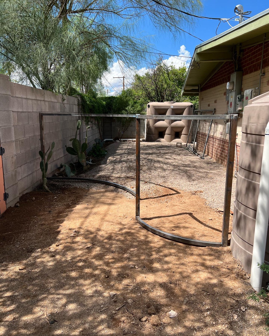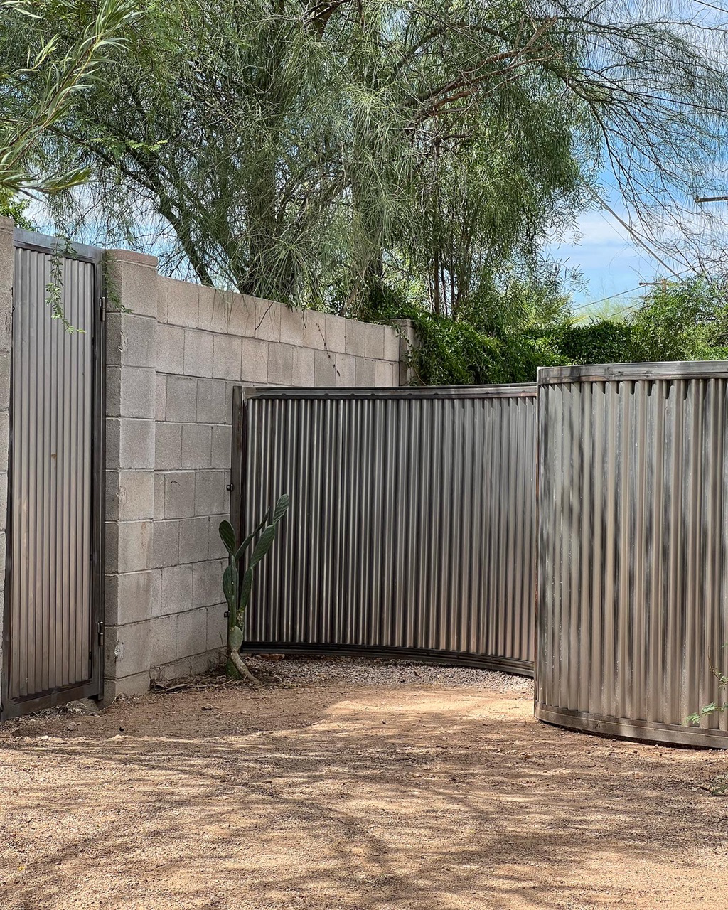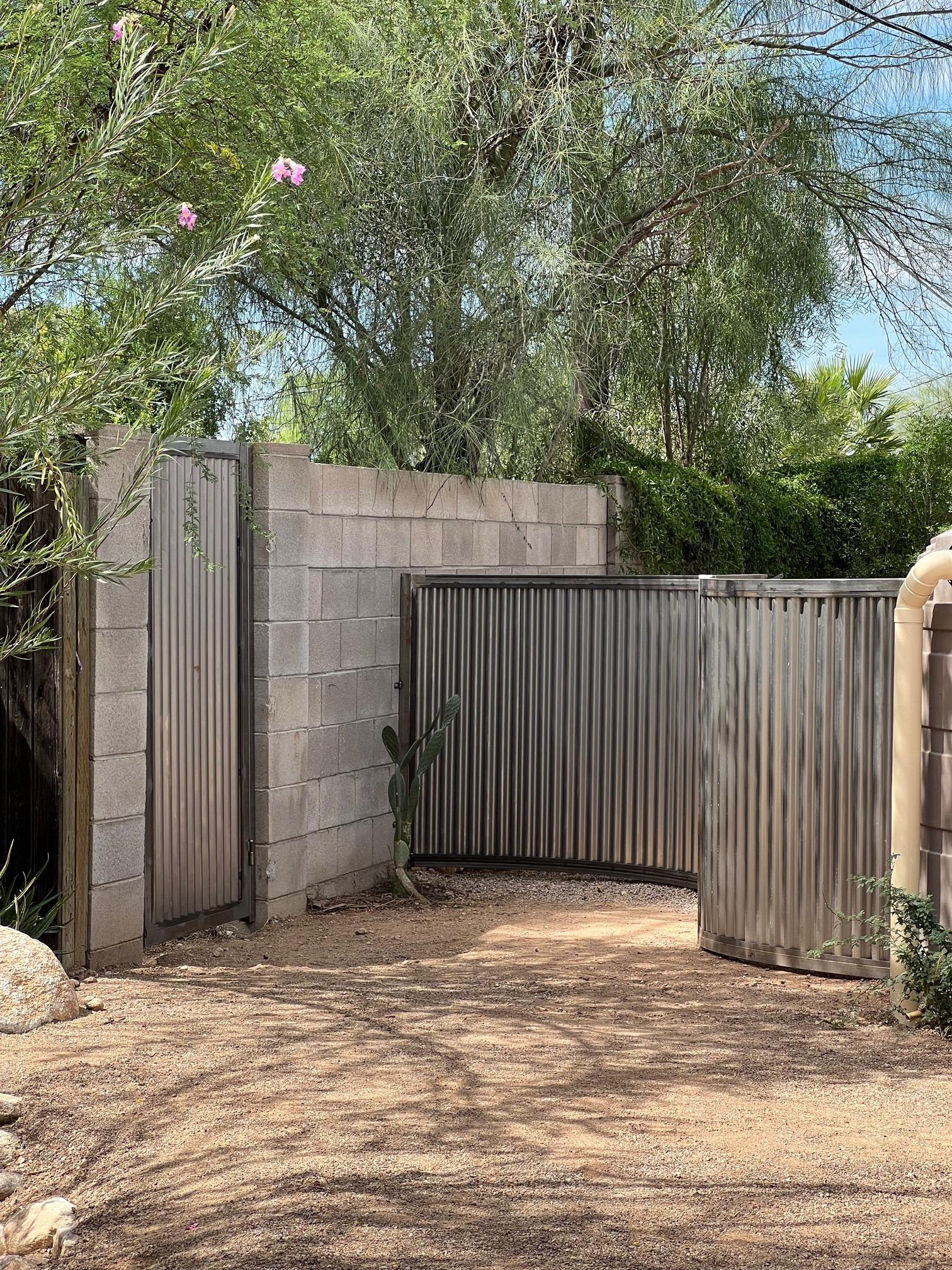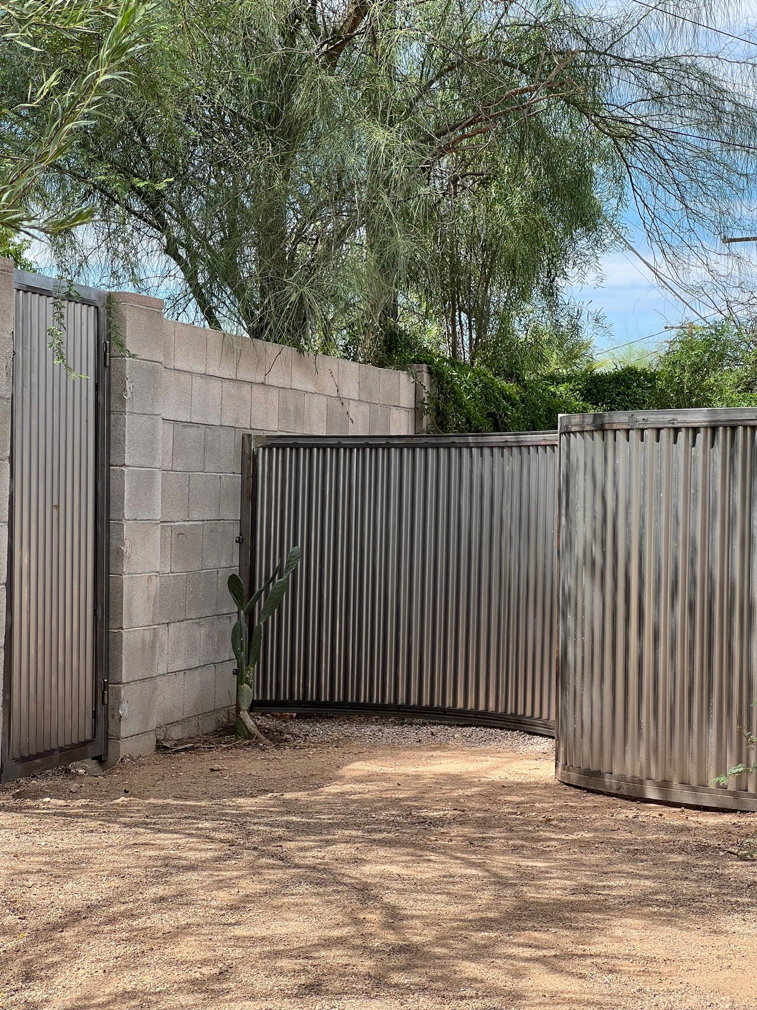 Curved fence with corrugated steel. Two matching gates (one hidden in the curve).