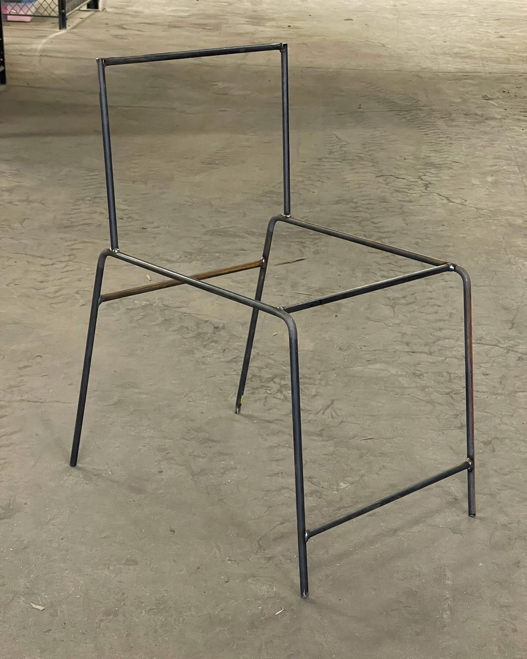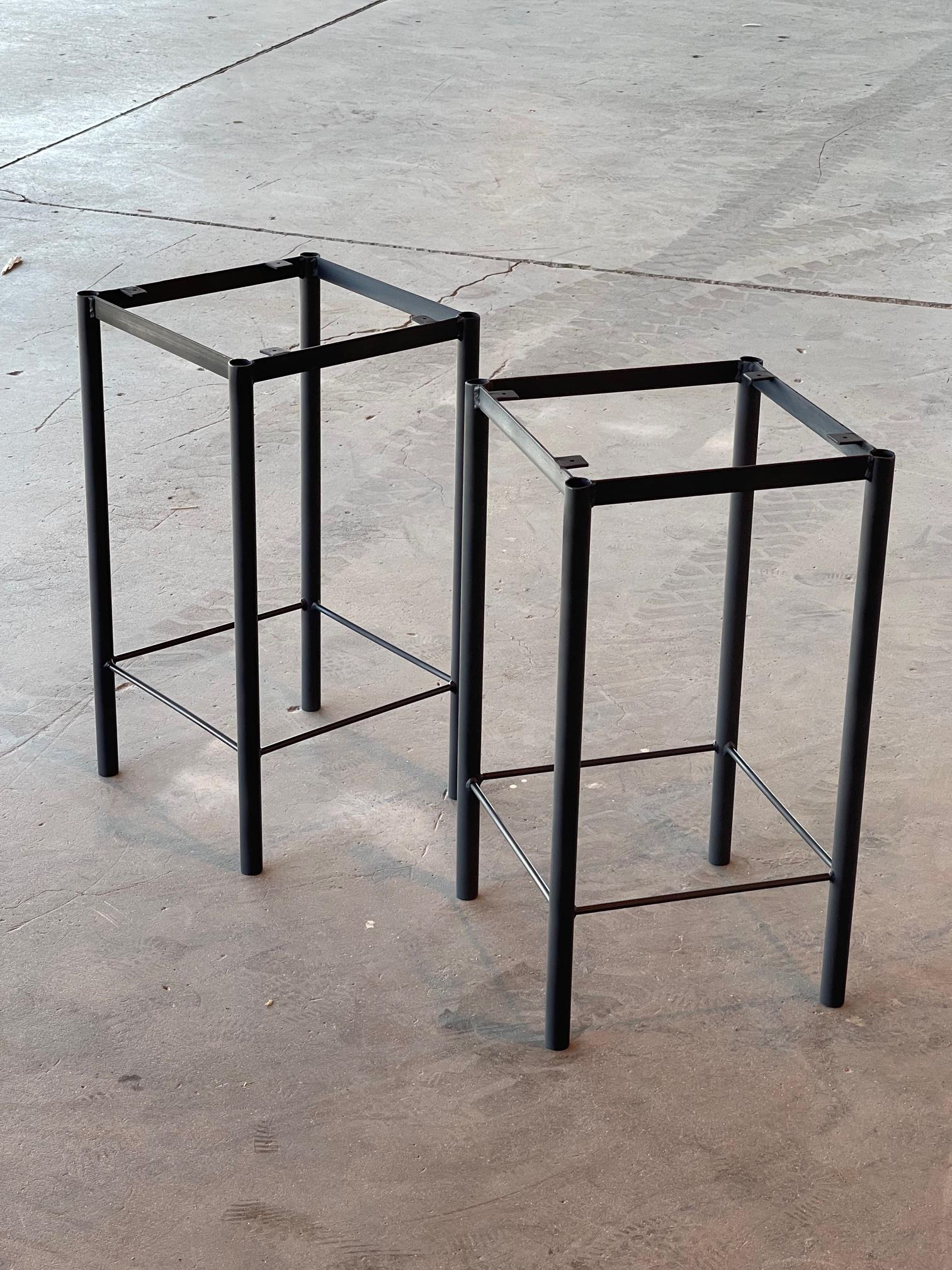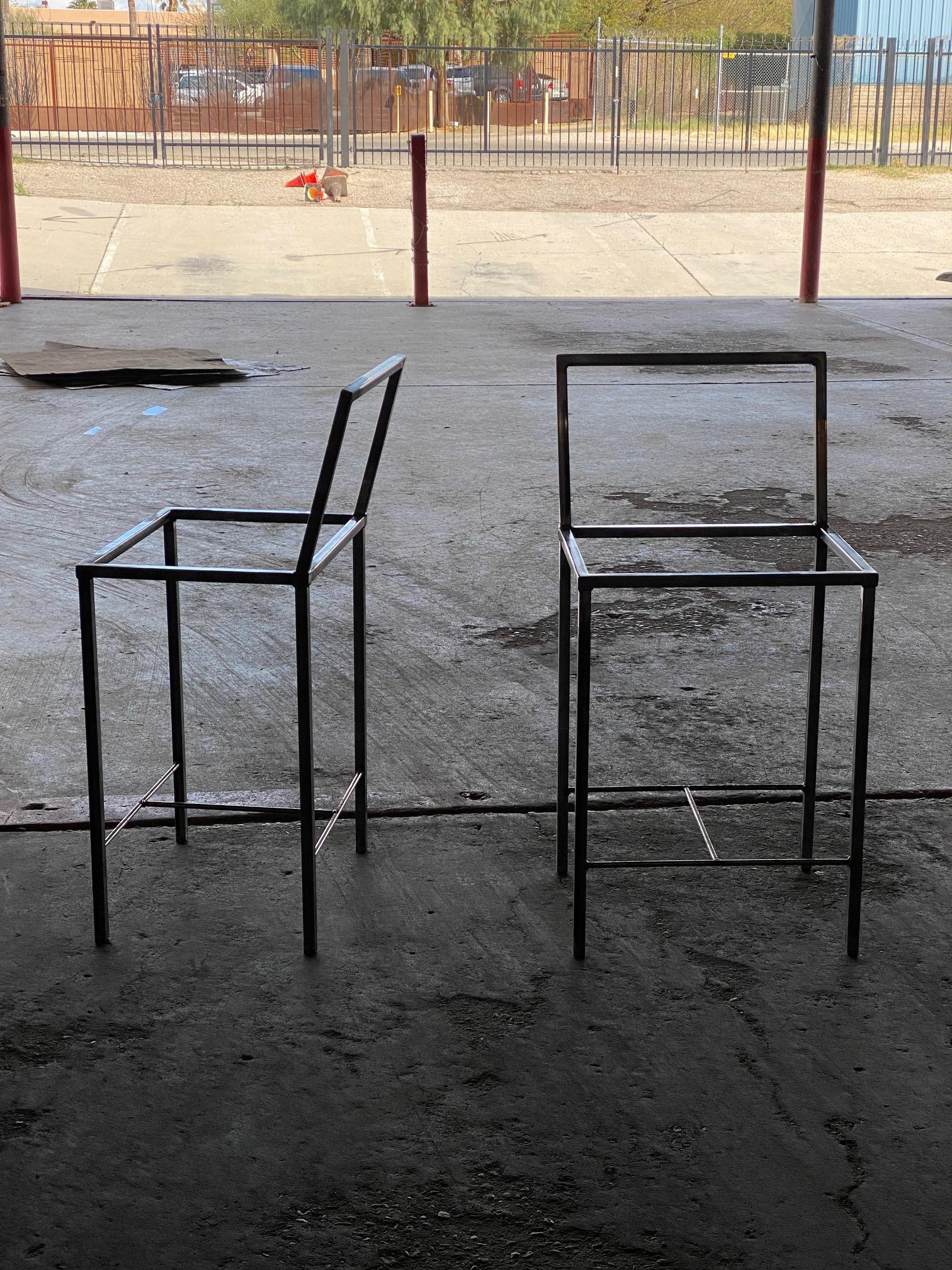 A pair of unfinished stools in the shop, ready for patina and hand sewn canvas backs