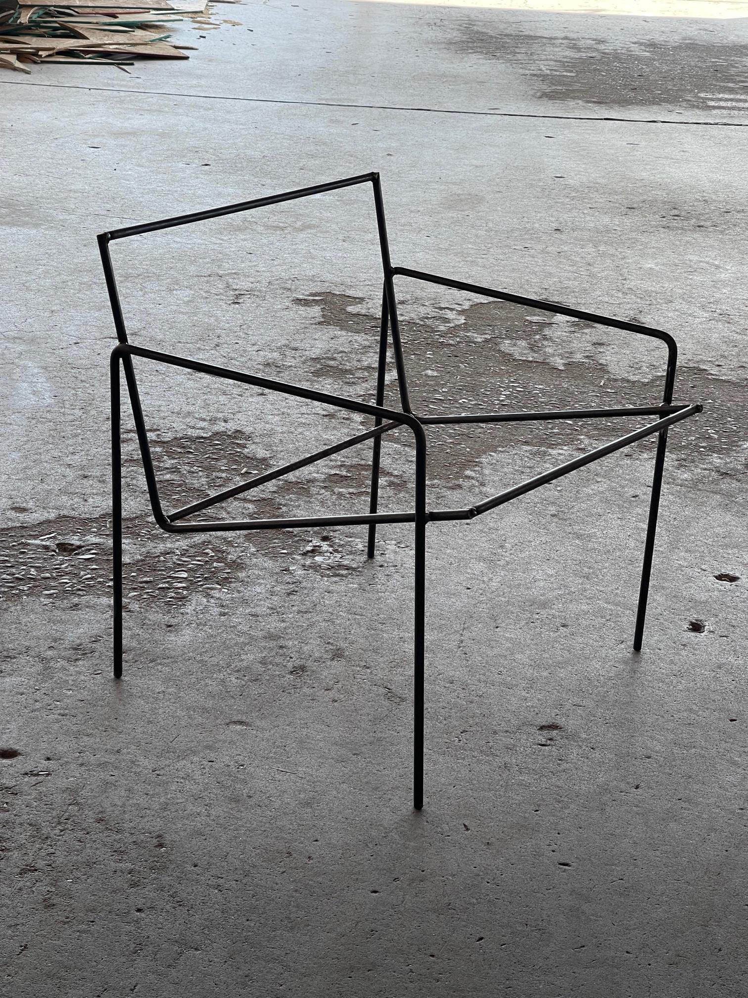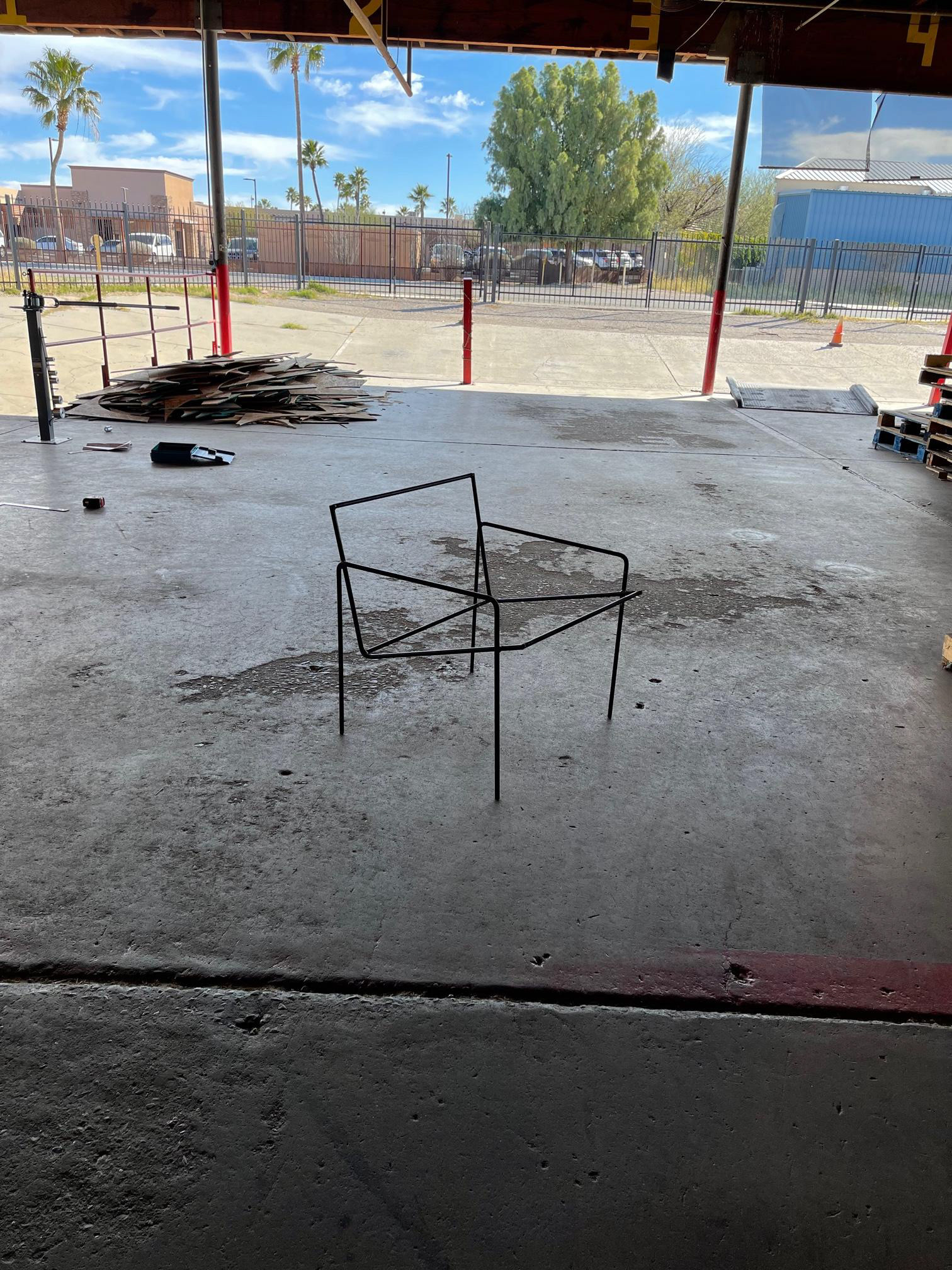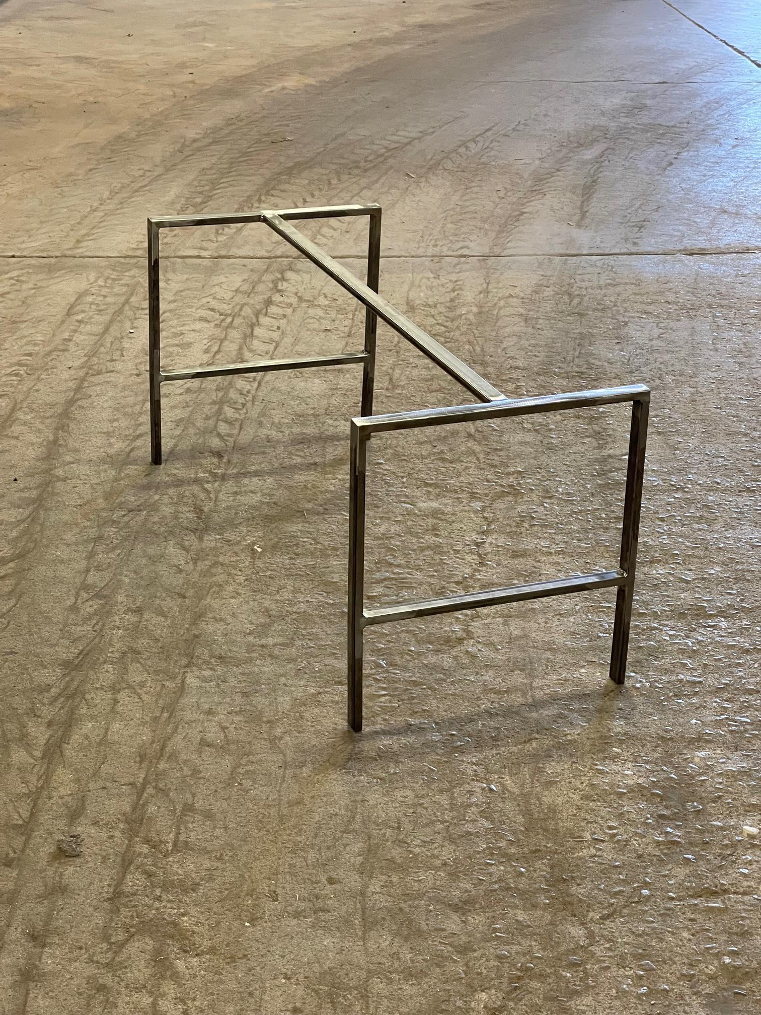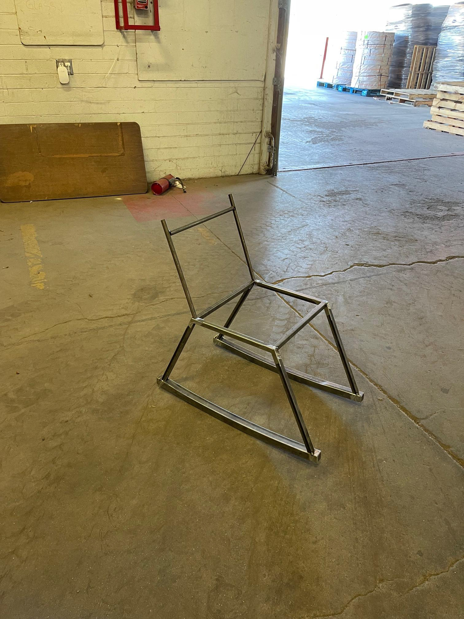 A pair of unfinished stools in the shop, ready for patina and hand sewn canvas backs