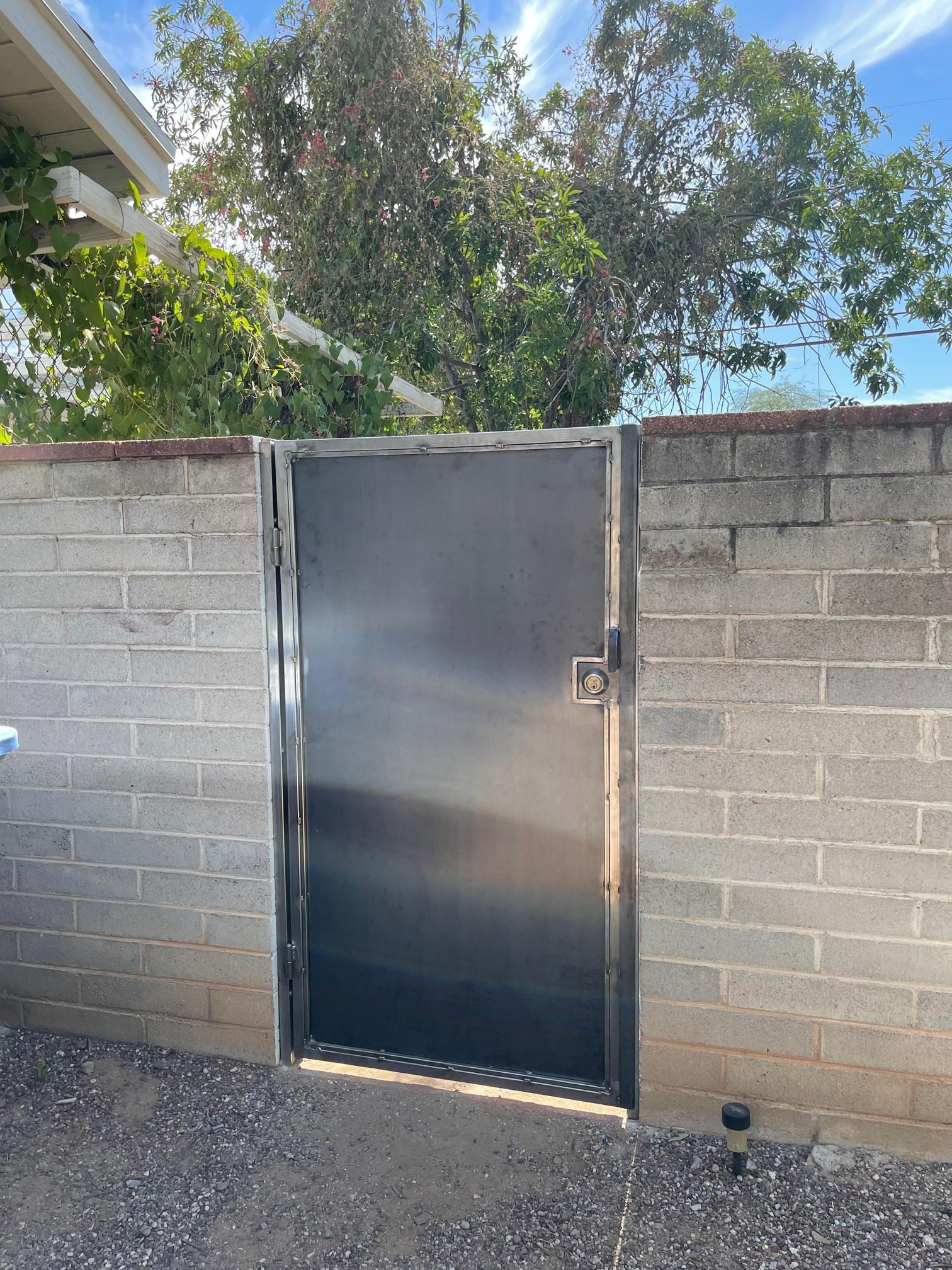 Two matching solid steel security doors to enclose client's yard. Raw steel finish for natural rust.