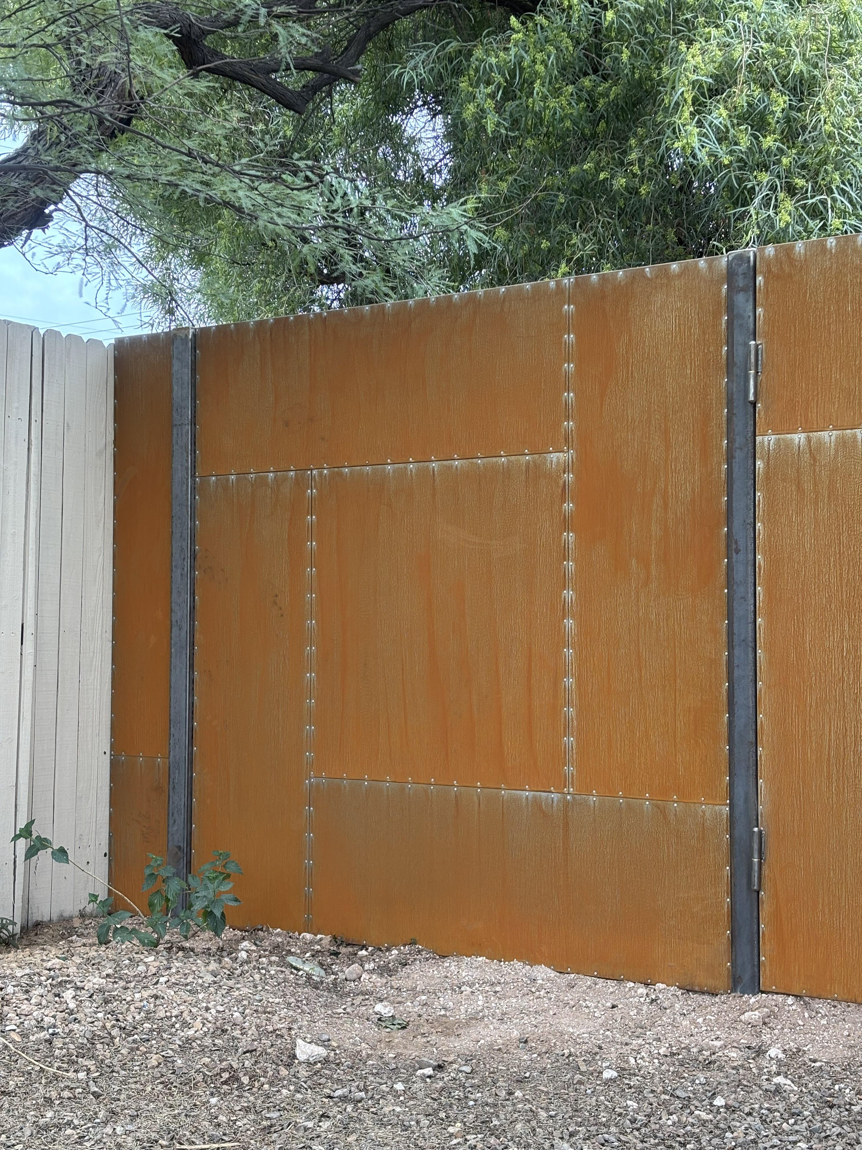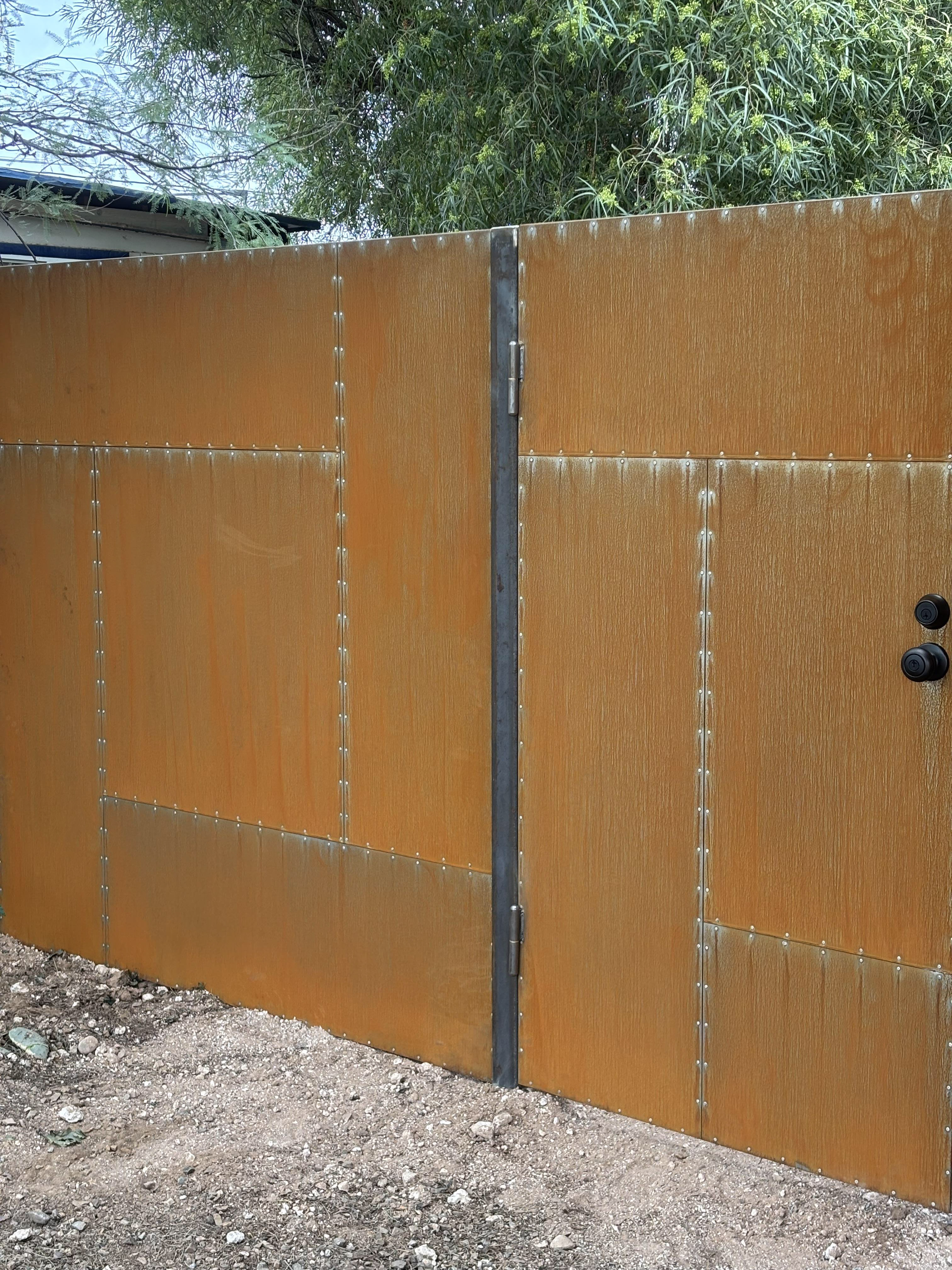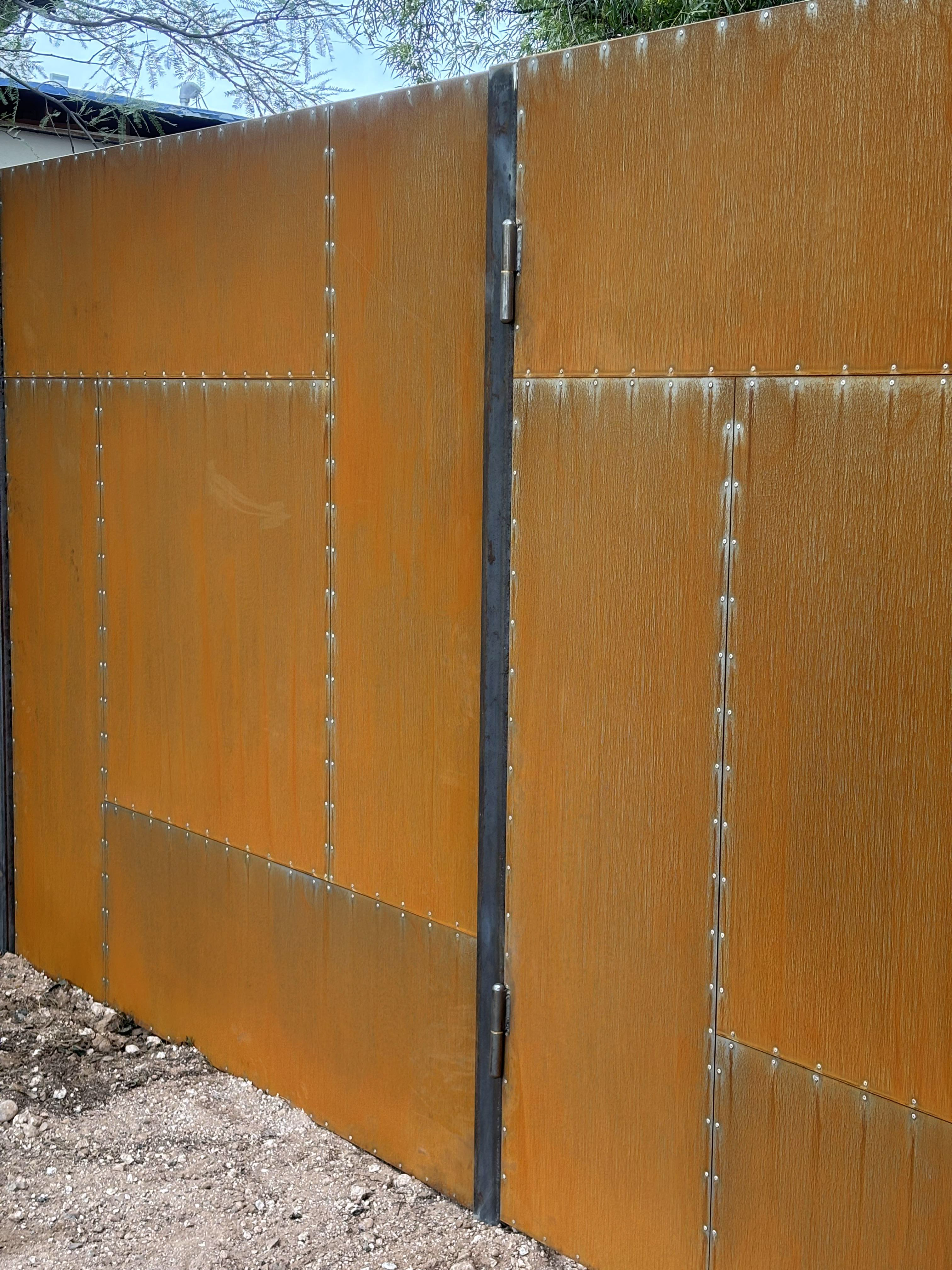 Solid steel fence and gates with aluminum rivets and a rust finish that will continue to rust naturally.
