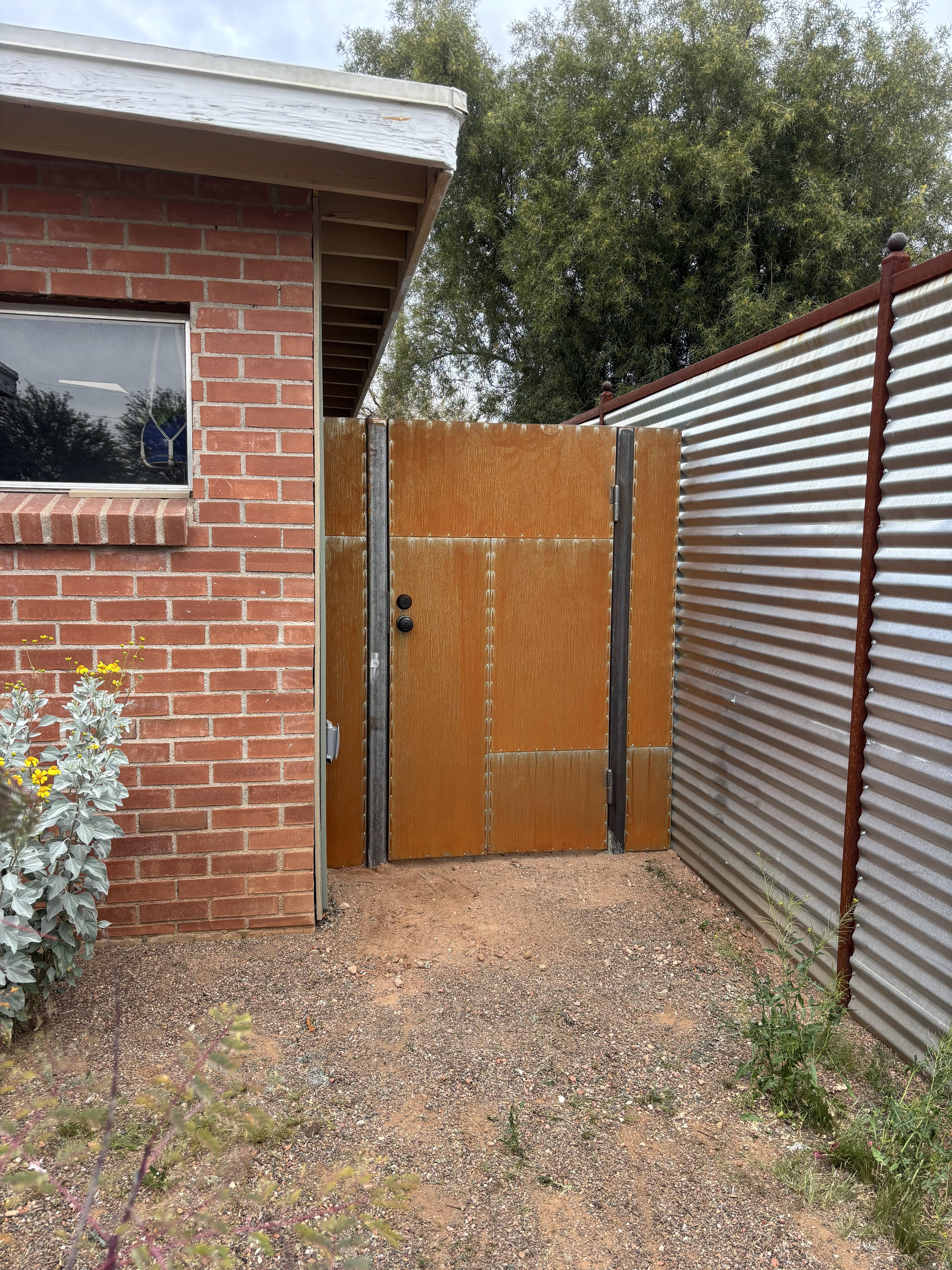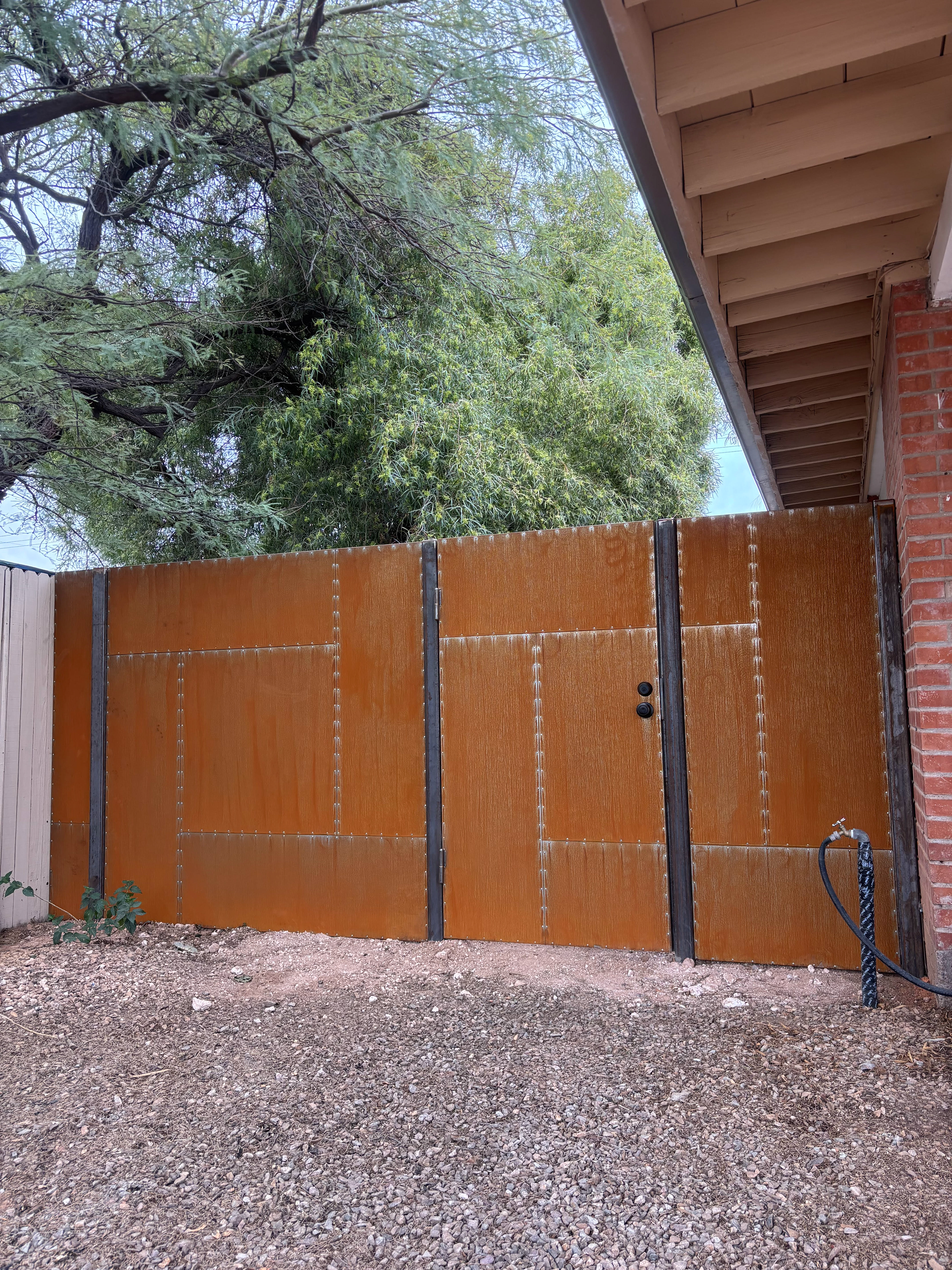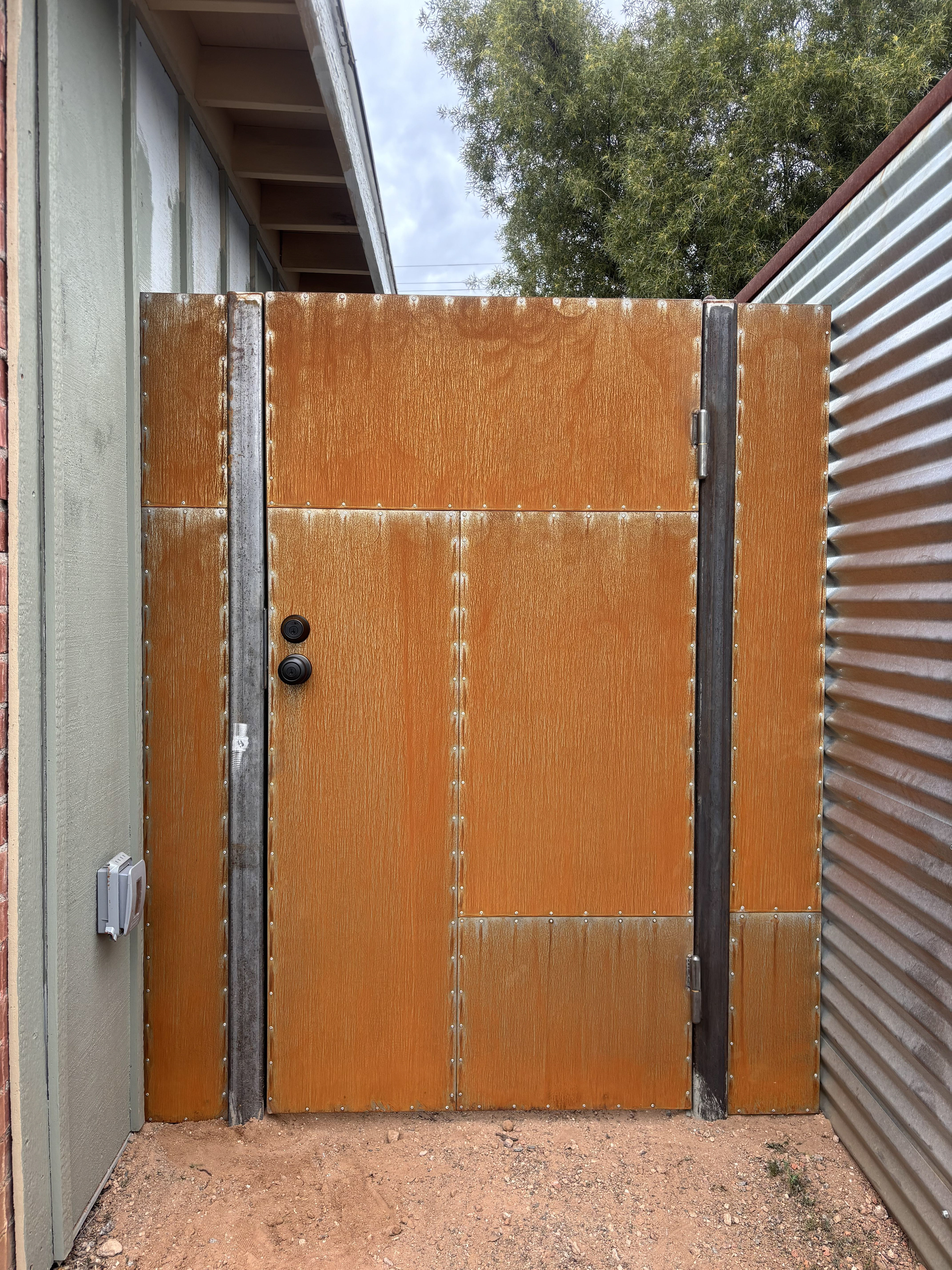 Solid steel fence and gates with aluminum rivets and a rust finish that will continue to rust naturally.